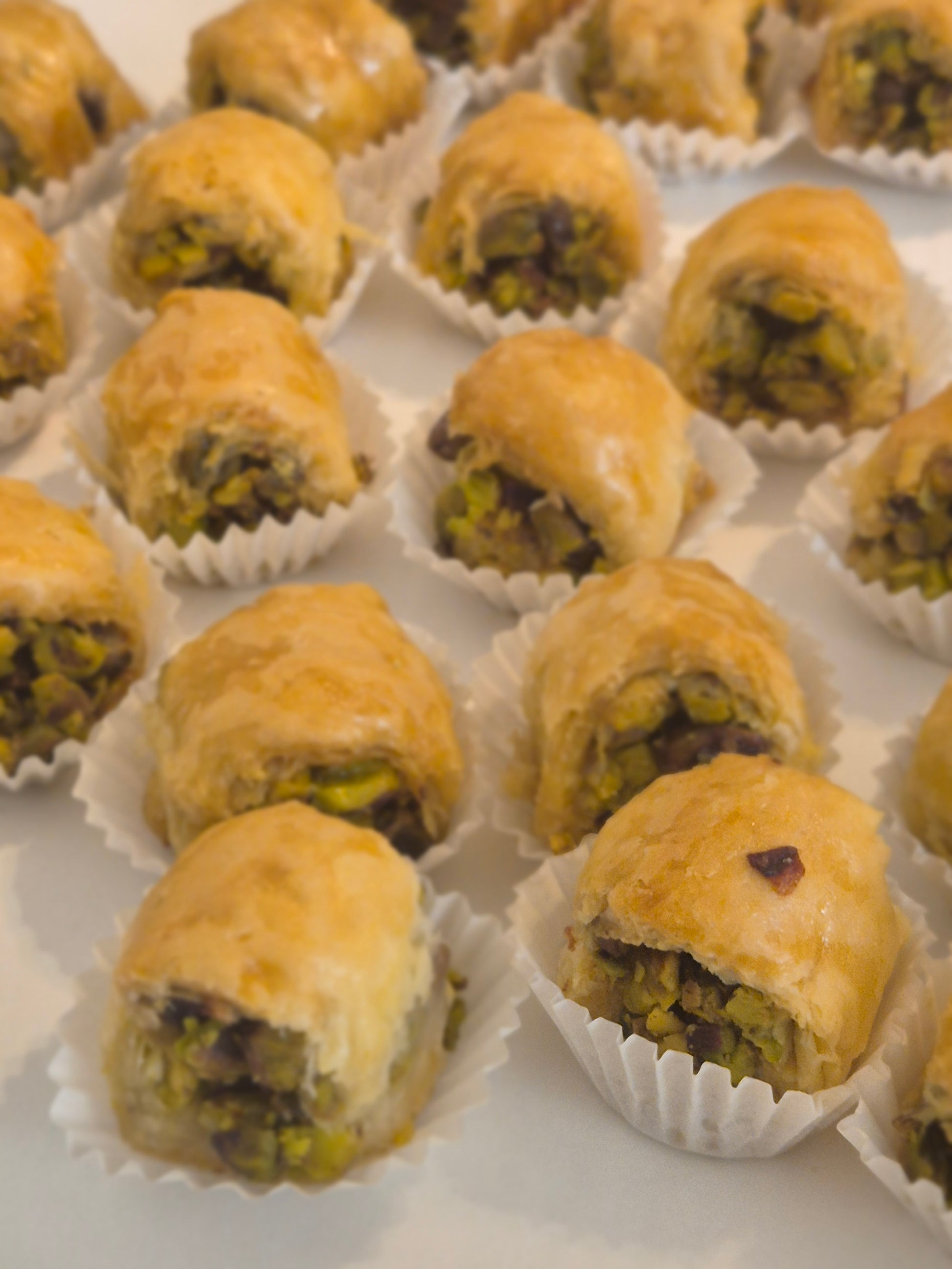 chopped pistachio, rolled in layers of crispy phyllo dough, sprinkled with simple syrup.